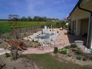 Bachlauf nach Geländemöglichkeiten, Quellstein in Teich integriert.